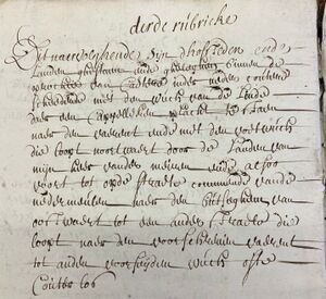 Dit naervolghende sijn d'hofsteden ende landen ? ? gheleghen binnen de prochie van Castere inder ? ? Scheldelede ? dan wests van de Linde ? ? Capellestrate plaest (?) ? naest den ?ut middel den Vollbeeck die loopt noordwaert door de landen van mijn heer Vander Meulen (?) ? alsoo voort tot opden straete commende vanden Nedermeulen naast de priesteraghie van oostweert tot die ander ? die loopt naer den voorse? vand? tot aud? voorschrijden wech ofte Couterlos.