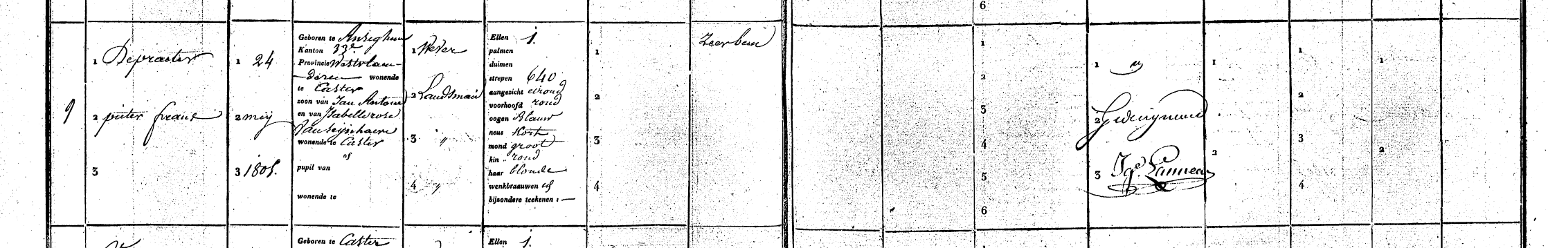 Uittreksel uit het militieregister van Kaster (1824); inschrijving van Pieter Depraetere.