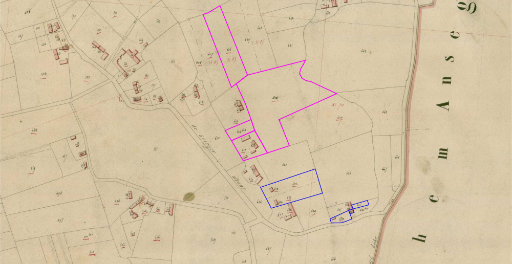 Zoom op de percelen van de familie De Praetere in Kaster. Pieter Francis De Praetere (blauw) en Jan Antone De Praetere (paars).